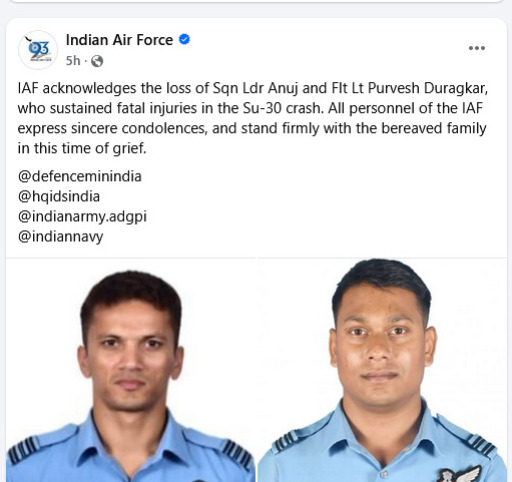 “IAF acknowledges the loss of Sqn Ldr Anuj and Flt Lt Purvesh Duragkar, who sustained fatal injuries in the Su-30 crash. All personnel of the IAF express sincere condolences and stand firmly with the bereaved family in this time of grief,” it said.