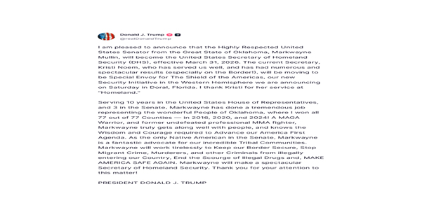 President Donald J. Trump has replaced Kristi Noem with Oklahoma Sen. Markwayne Mullin as the next U.S. Secretary...