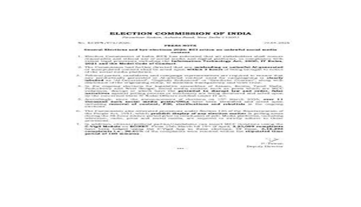 Election Commission of India (ECI) has reiterated that all stakeholders shall ensure responsible and ethical use of social media and digital platforms, in compliance with extant legal provisions including the Information Technology Act, 2000, IT Rules, 2021 and the Model Code of Conduct.
