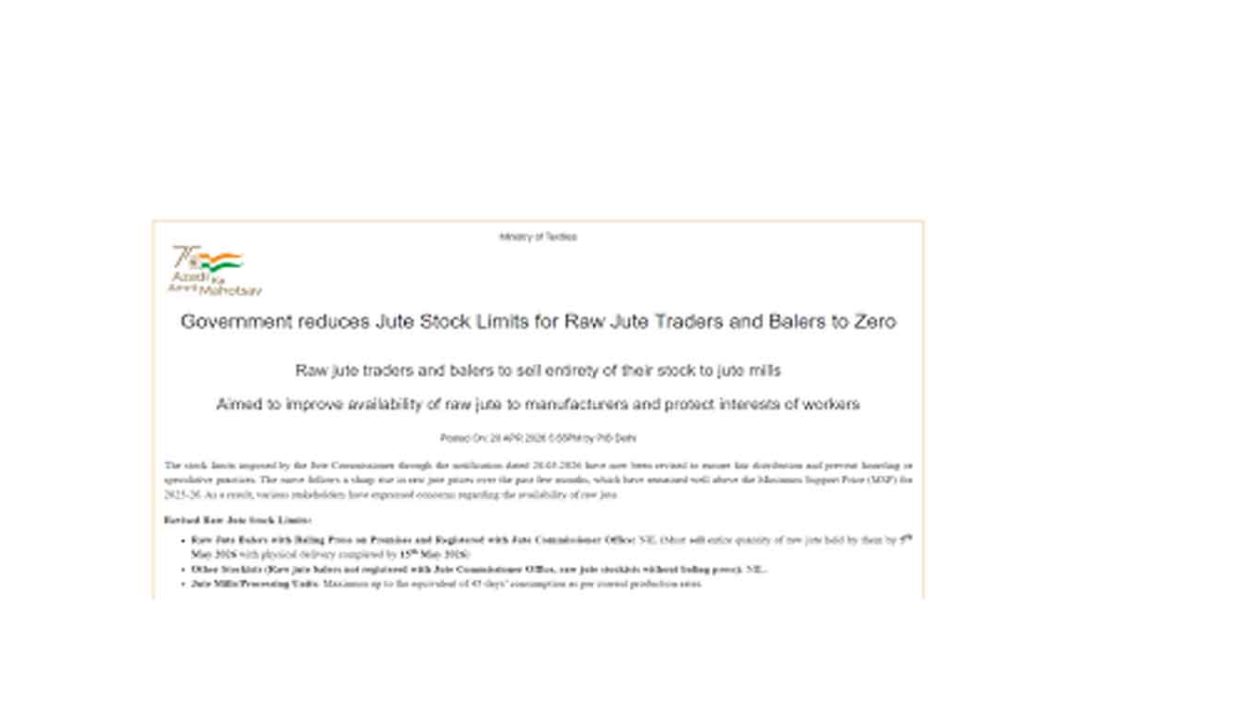 The stock limits imposed by the Jute Commissioner through the notification dated 20.03.2026 have now been revised to ensure fair distribution and prevent hoarding or speculative practices. The move follows a sharp rise in raw jute prices over the past few months, which have remained well above the Minimum Support Price (MSP) for 2025-26. As a result, various stakeholders have expressed concerns regarding the availability of raw jute.