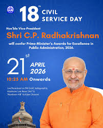 The Department of Administrative Reforms and Public Grievances (DARPG), Ministry of Personnel, Public Grievances and Pensions will observe 18th Civil Services Day on Tuesday, April 21, 2026. Hon’ble Vice President of India, Shri C. P. Radhakrishnan, will grace the event at Vigyan Bhawan, New Delhi as the Chief Guest. He will deliver the keynote address.