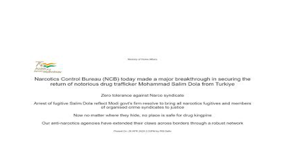 Union Home Minister and Minister of Cooperation Shri Amit Shah said that in line with Modi Government’s policy of Zero tolerance against Narco syndicate, the NCB today made a major breakthrough in securing the return of notorious drug trafficker Mohammad Salim Dola from Turkiye.