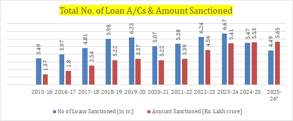 Women Borrowers: A total of ₹9.02 lakh crore was disbursed under the Shishu category, ₹ 6.22 lakh crore under Kishor, and ₹ 1.09 lakh crore under the Tarun category.