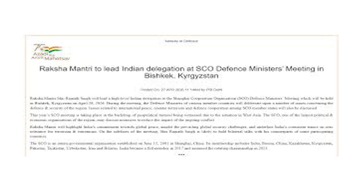 Raksha Mantri Shri Rajnath Singh will lead a high-level Indian delegation to the Shanghai Cooperation Organisation (SCO) Defence Ministers’ Meeting which will be held in Bishkek, Kyrgyzstan on April 28, 2026. During the meeting, the Defence Ministers of various member countries will deliberate upon a number of issues concerning the defence & security of the region. Issues related to international peace, counter-terrorism and defence cooperation among SCO member states will also be discussed.