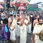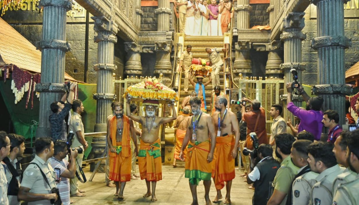 Following the conclusion of the Sabarimala pilgrimage season, the Thiruvabharanam return procession has set out towards the Srambikkal Palace at Pandalam. After the Ganapathi Homam, the procession began its journey at 6:15 a.m., descending the sacred eighteen steps under the leadership of Periyaswami Maruthuvana Sivankutty.