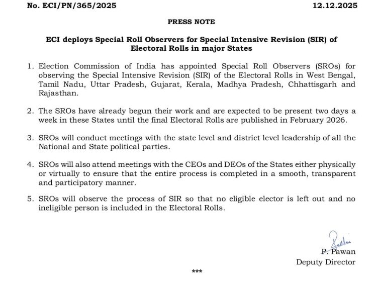 ECI deploys Special Roll Observers for Special Intensive Revision (SIR) of Electoral Rolls in major States