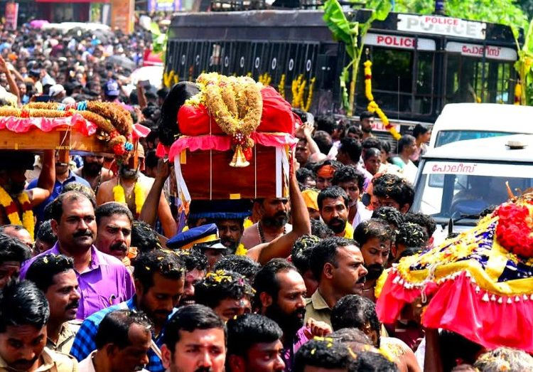 The ceremonial procession carrying the Thiruvabharanams (sacred ornaments) to be adorned on Lord Ayyappa for the Makaravilakku festival...